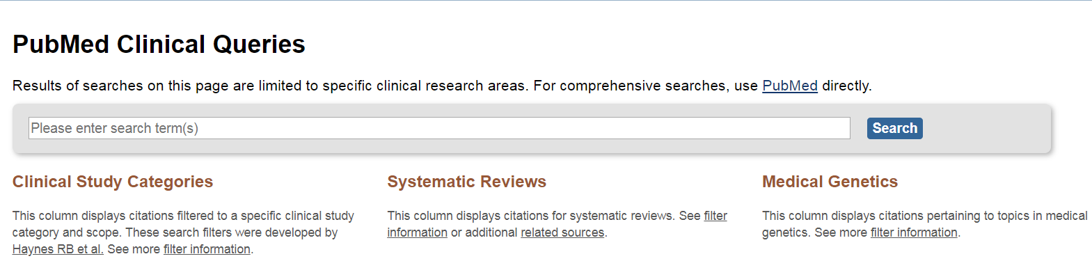 The PubMed Clinical Queries search is designed to filter one search by three clinical research areas: Clinical Study Categories, Systematic Reviews, and Medical Genetics.