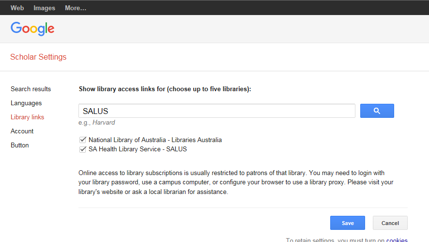 To search Google Scholar and include automatic links to the SALUS full text subscriptions, please add SALUS to your settings in Google Scholar. Please note these links can be unreliable at times.